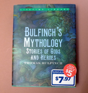 As for Bulfinch, well, mythology rules! And Bulfinch is the traditional go to reference for mythology–still. I was just walking along the sidewalk passing by the big box bookstore and there on the sidewalk kiosk shelves beside me beckoned a twice marked down Bulfinch’s Mythology, centaurs and gorgons and tunicked goddesses and gods flying out of the book as I picked it up and flipped through it. Serendipity!